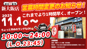 【11月1日〜】新大阪店 営業時間変更のお知らせ